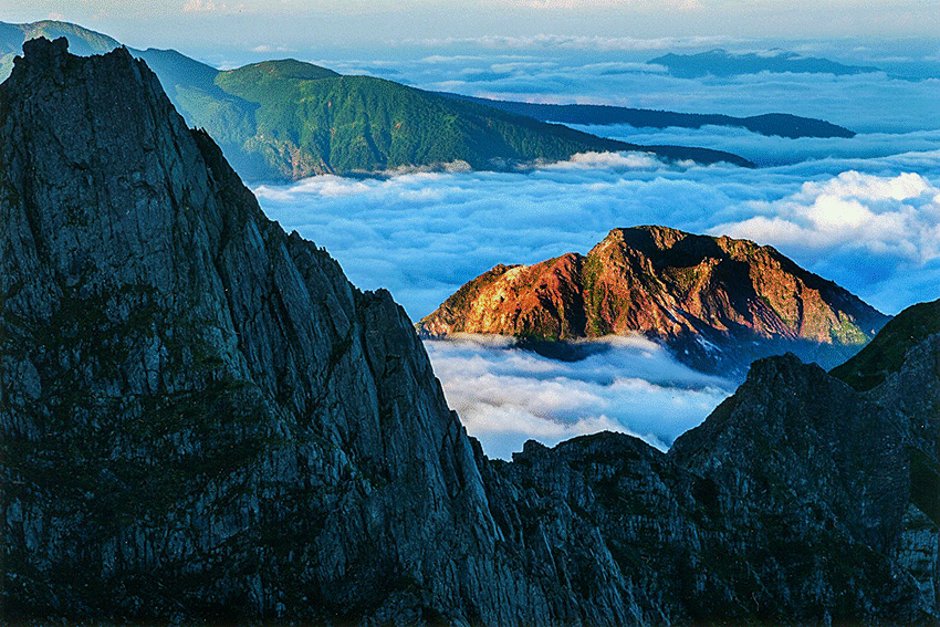 「 朝日射す焼岳 」 |