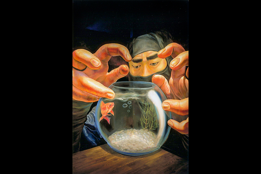 画題 「 金 魚 に 忍 術 か け る 2 」 奥村 博己